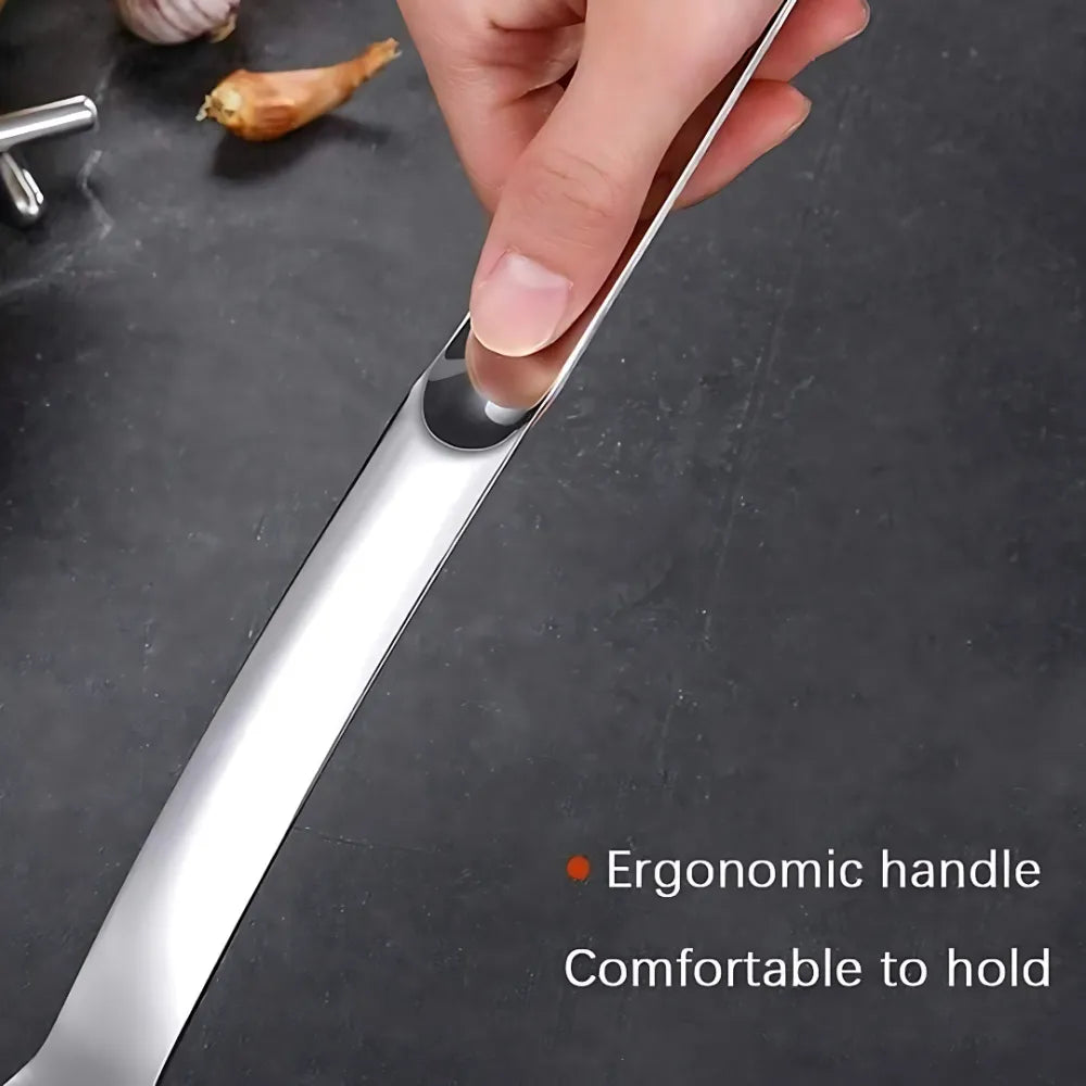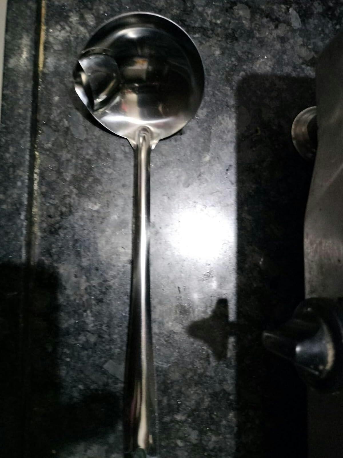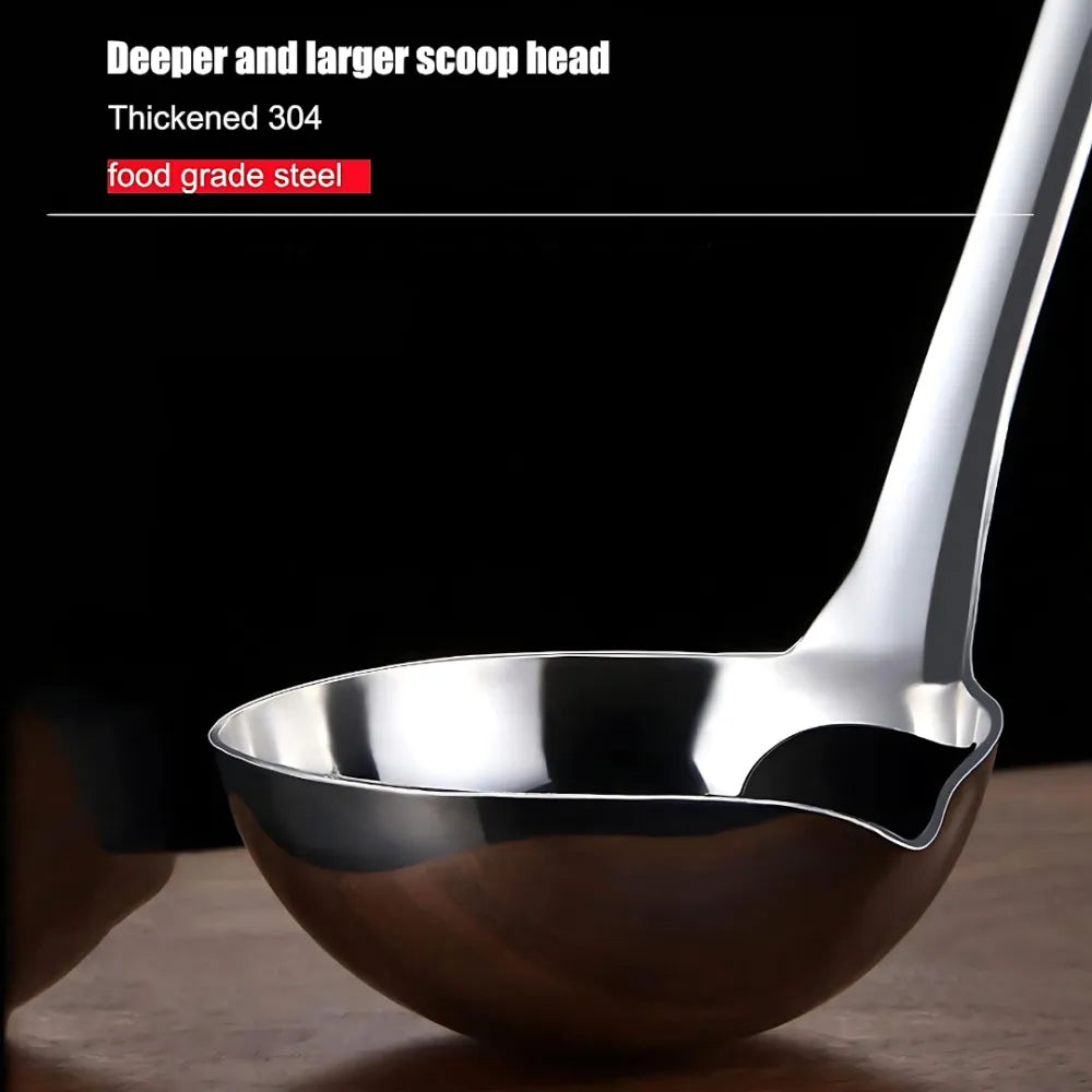 Long handle and large enough soup scoop, it will protect you from scald, and the handle with a hole is easy to hang while the spoon is not in use