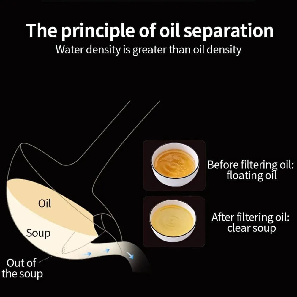 oil and water are immiscible, and the density of oil is lower than that of water, which is why the oil floats on the soup; Because the outlet of the small hole is deeper, the clear soup will flow out from the lower hole first when pouring, to achieve the effect of oil-water separation.