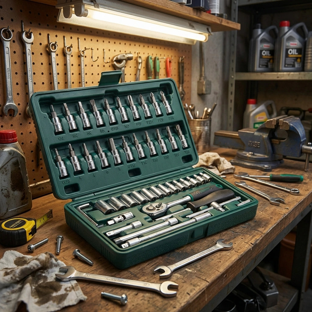 Tackle any repair task with ease! This 46-Piece 1/4" Socket Set includes a ratchet, extensions, and universal joint for automotive and DIY projects.