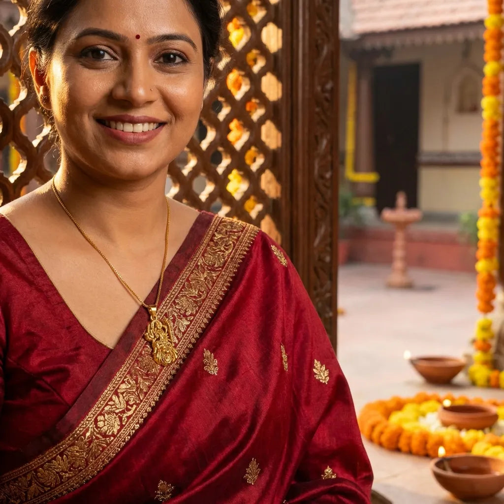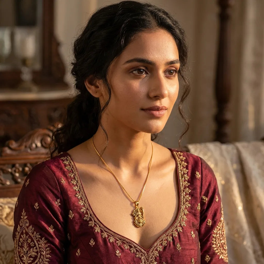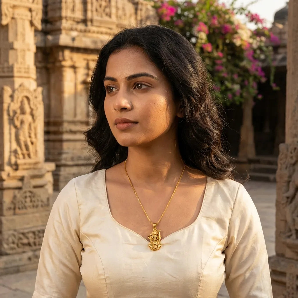 Elegant gold-plated Ambe Mataji pendant with chain — perfect for daily wear and gifting.