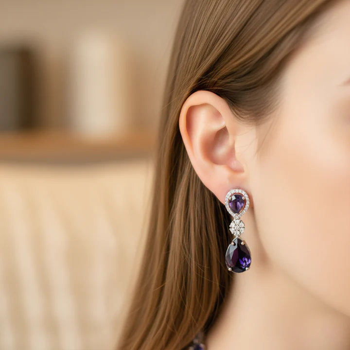 This exquisite jewelry set showcases a captivating combination of sparkling American Diamonds and deep purple gemstones, arranged in an elegant teardrop pattern. Designed to exude grace and sophistication, the necklace and matching earrings create a stunning visual appeal. Perfect for formal occasions, this set adds a touch of royalty and charm to any outfit, ensuring you shine with refined elegance.