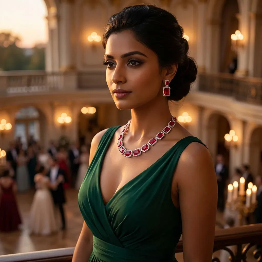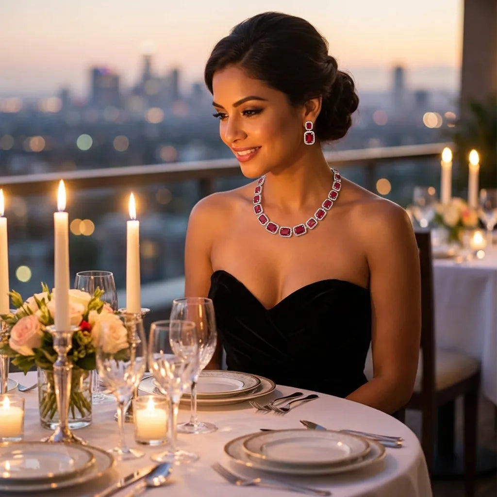 Timeless Design: The classic choker necklace paired with dazzling red gemstone earrings creates a harmonious and elegant look.