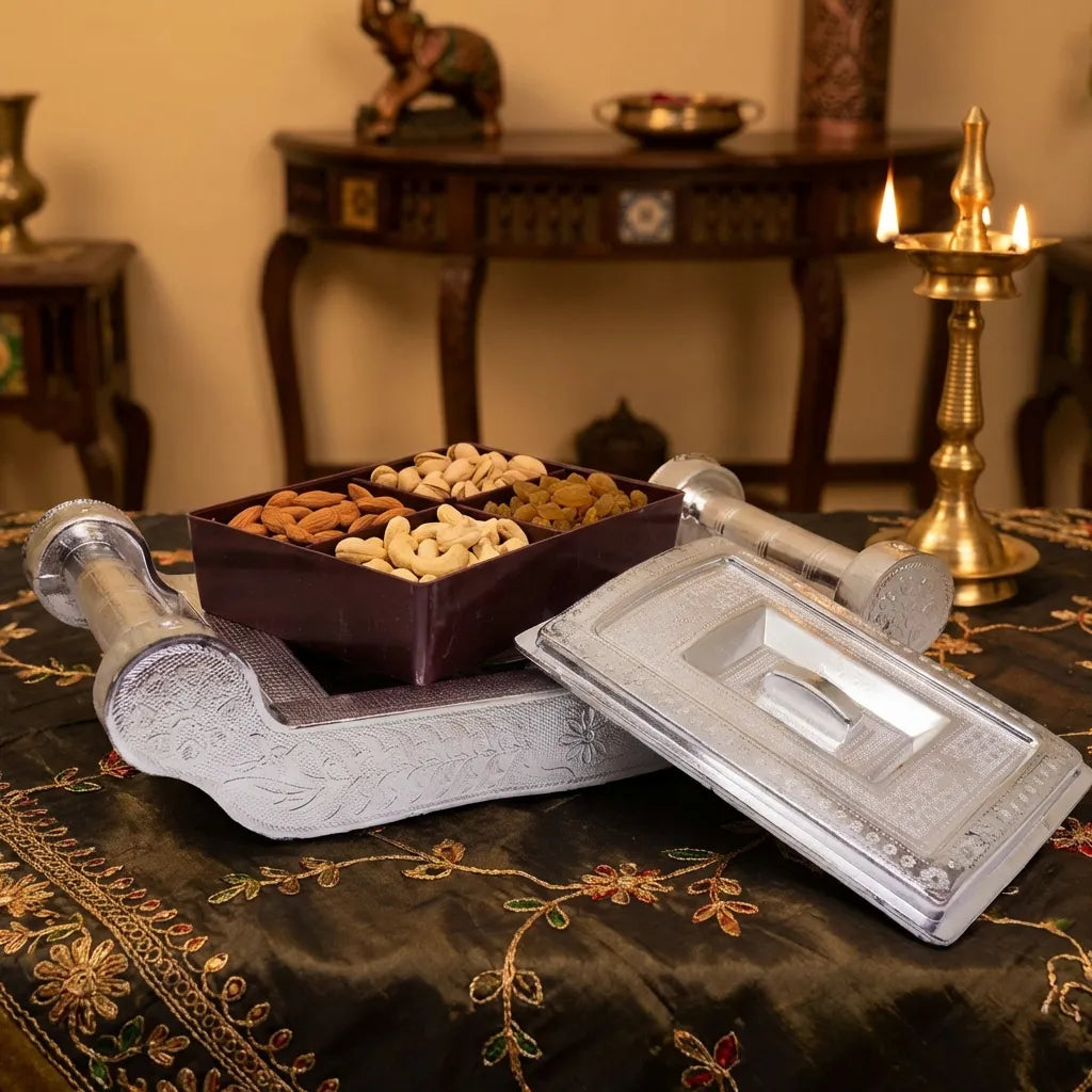 Stylish 4-section silver box for serving or gifting dry fruits, chocolates, and sweets—perfect for weddings, festivals, and home decor!
