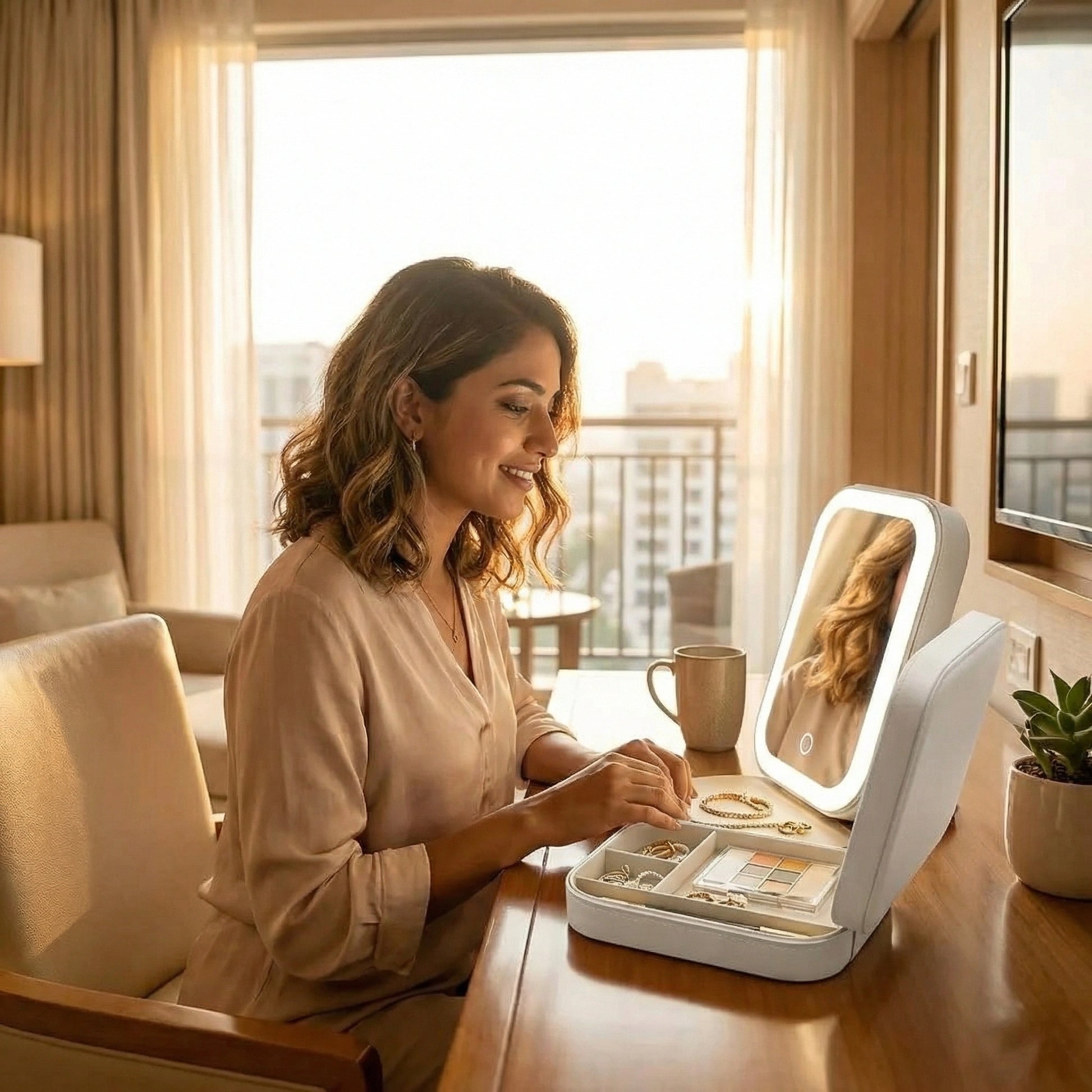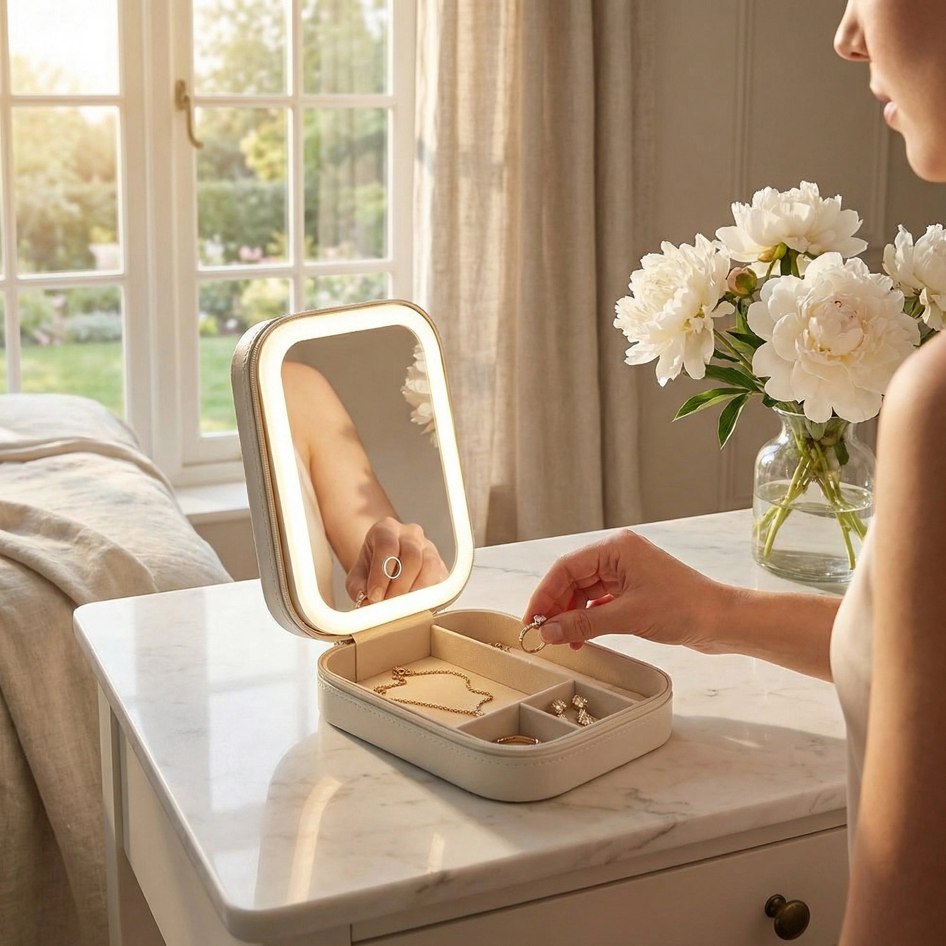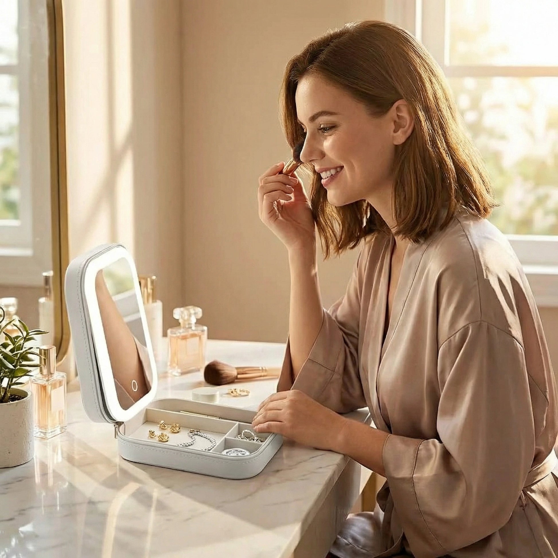 - LED Mirror Built-In: Bright, soft light ideal for makeup or selecting jewelry.