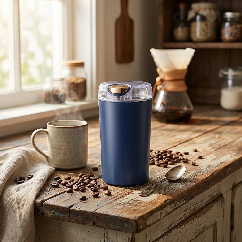 Grind coffee, spices, and nuts fast with this low-noise, compact electric grinder—perfect for home or office use with easy cleaning and storage.