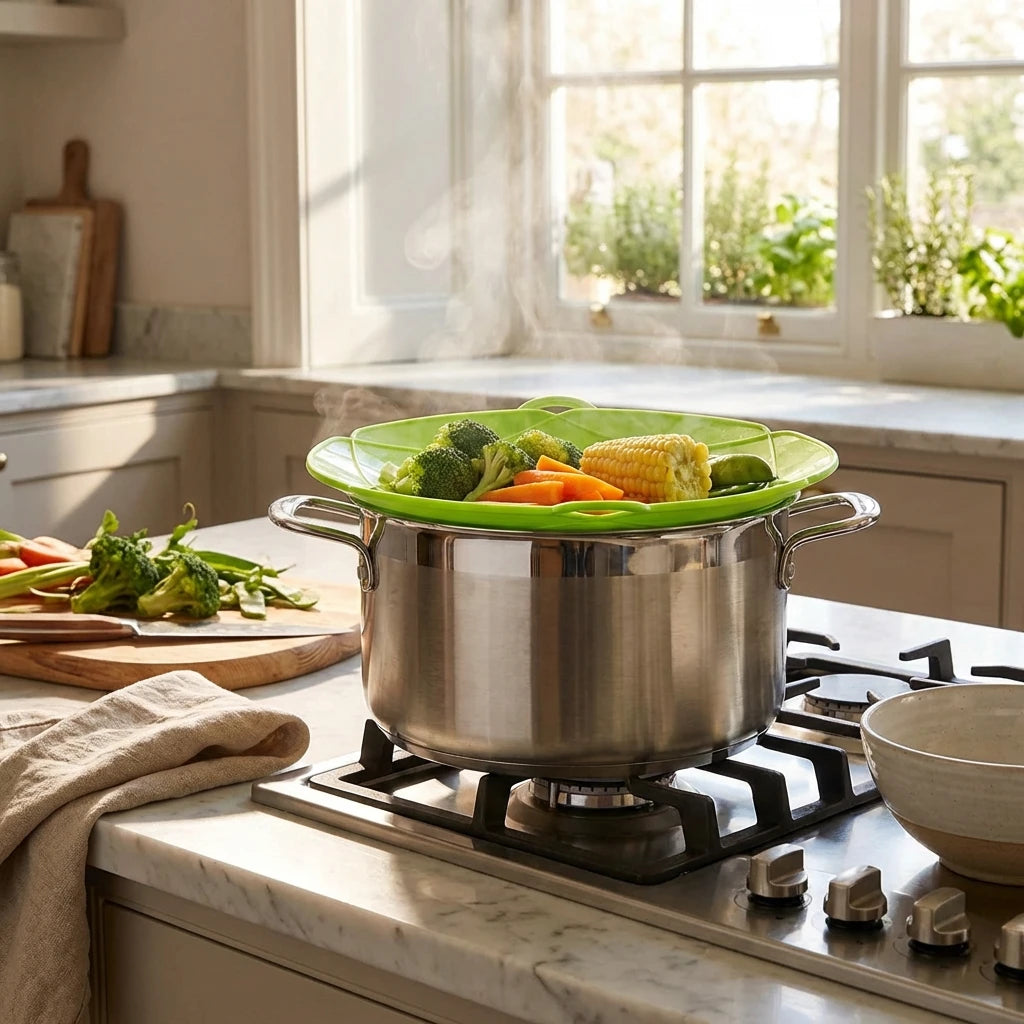 Say goodbye to messy boil-overs! This silicone lid prevents spills, fits various pots & pans, and doubles as a splatter guard.