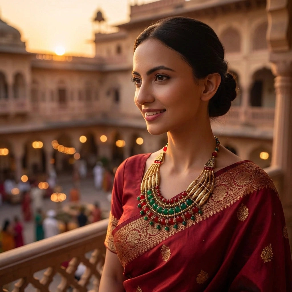 This Oxidised Fan-Shaped Necklace beautifully combines festive colors and intricate craftsmanship. The necklace showcases a fan-shaped oxidised design accented with layers of red and green beads. Golden metallic details and bead drops enhance its rich, traditional appeal. Perfect for adding a touch of cultural grace to your ethnic attire, this piece stands out with its balanced mix of color, texture, and artistry.
