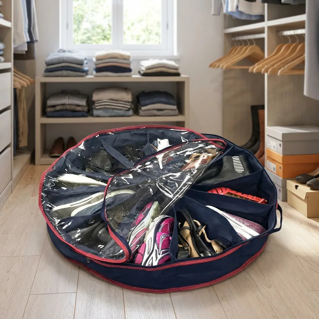This versatile shoe bag is designed for convenience, protection, and space optimization. Whether you're traveling or storing shoes at home, the dust-proof plastic cover keeps your footwear clean and protected. Its round, flexible divider system fits various styles and sizes of shoes, from sandals to formal footwear. Durable and waterproof, this shoe bag is a reliable companion for daily commuting or long trips.